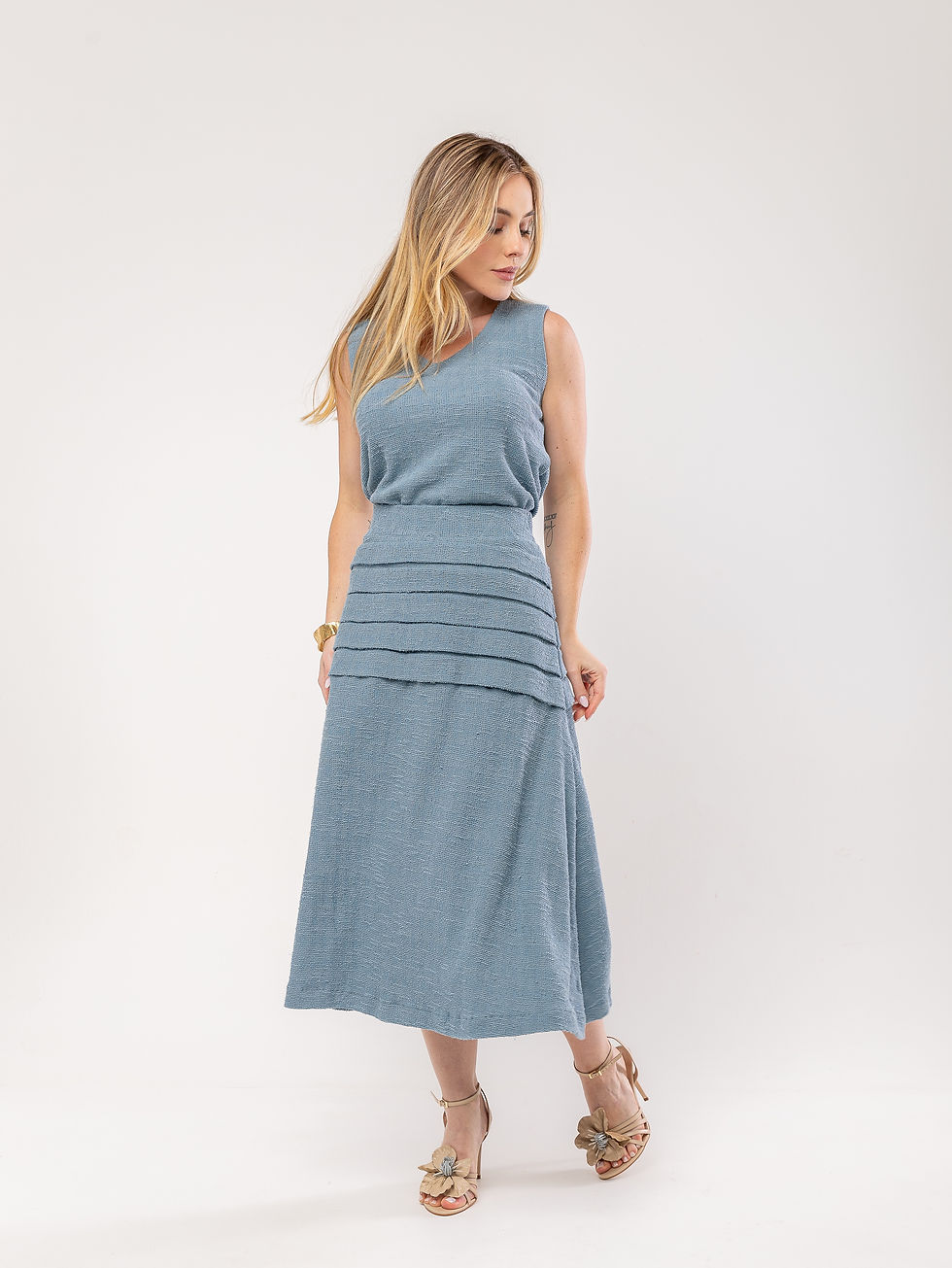 Calça flare em malha encorpada com elastano, elástico largo na cintura, bolso frontal e traseiro com pregas.